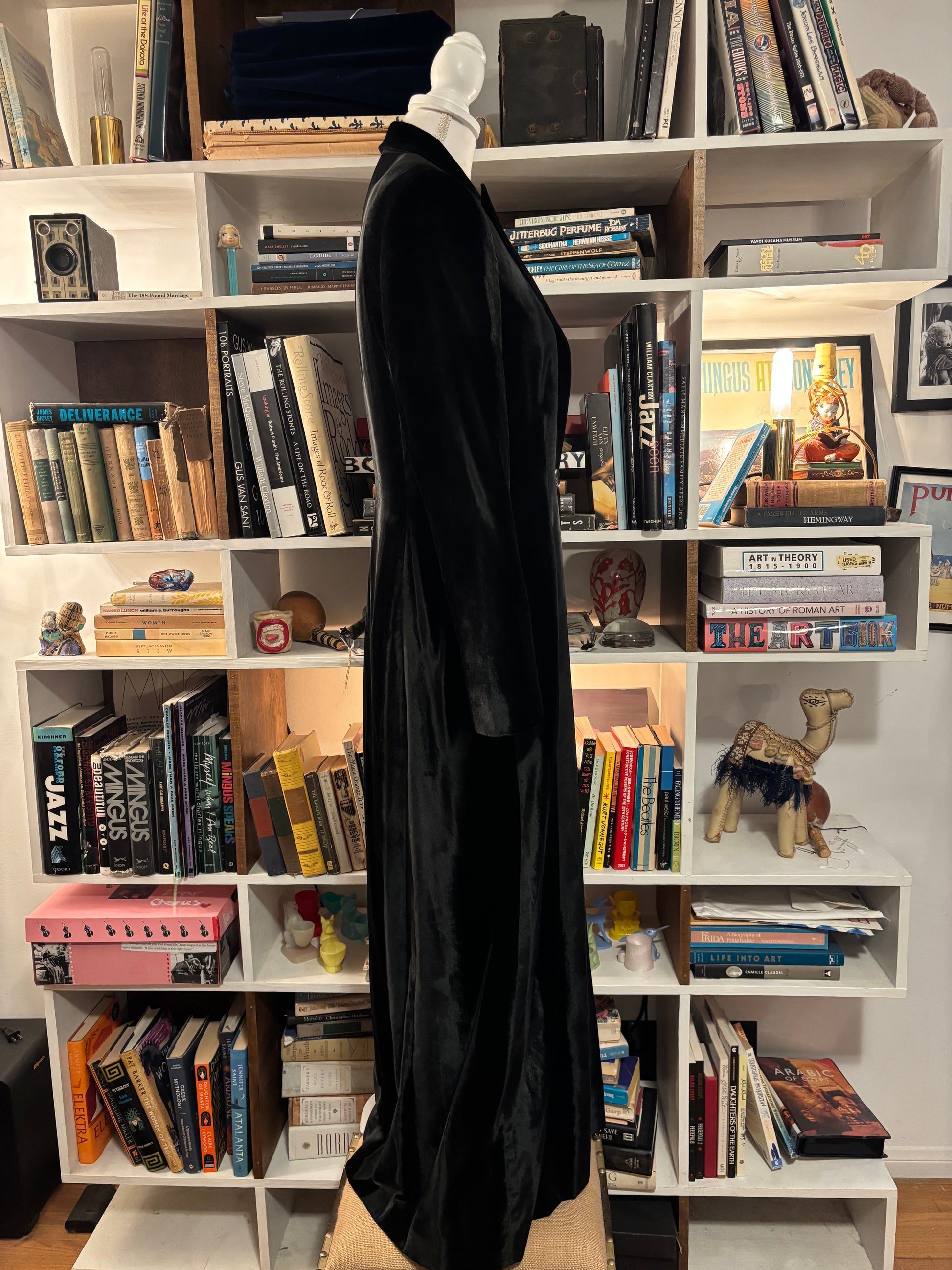 Gorgeous Richard Tyler long black velvet coat from his 1996 fall collection. This piece is extremely rare and unique. This coat has been stored well and is in excellent condition. Features button closure in the front and long slit in the back.
