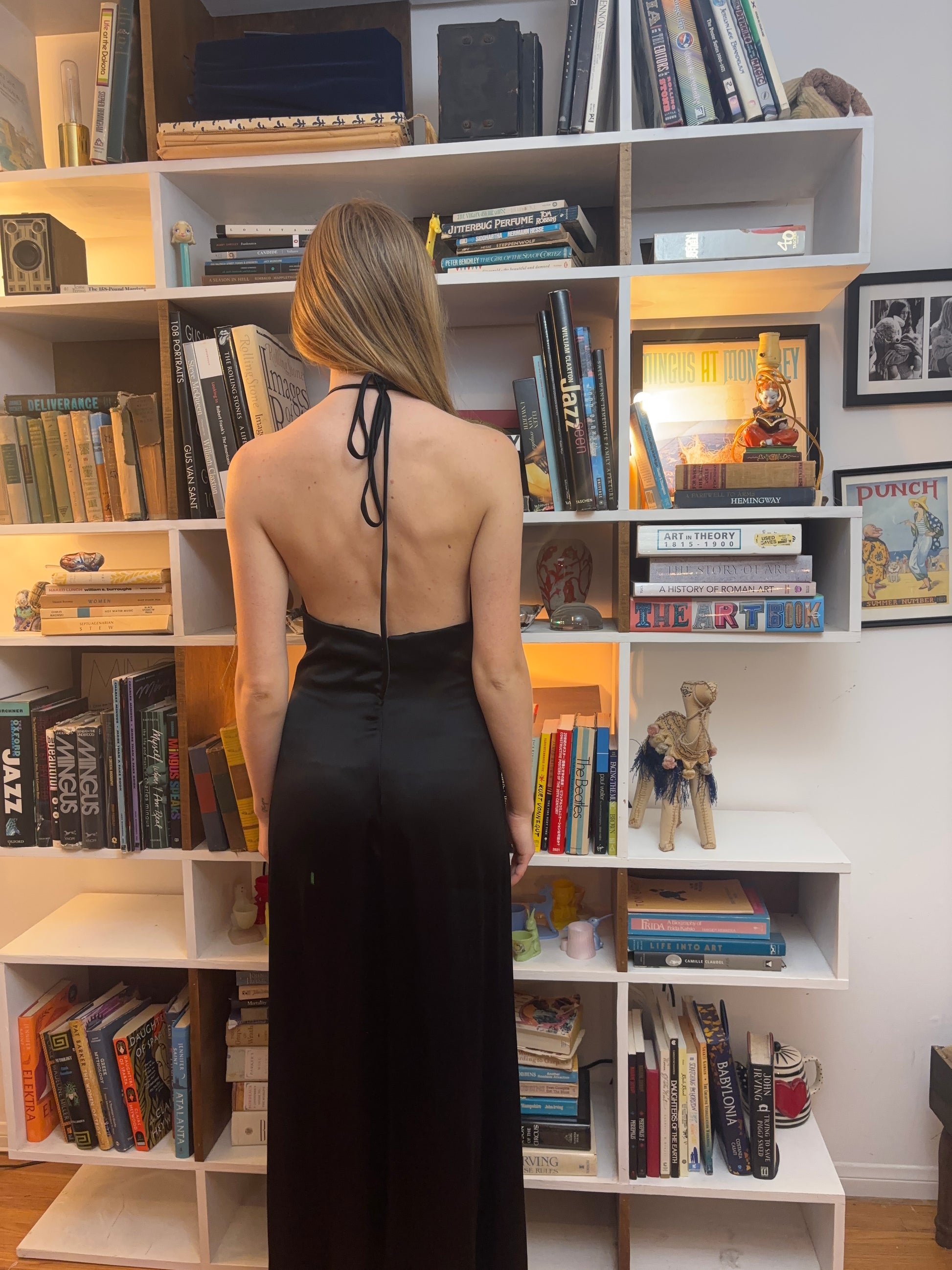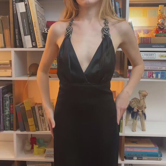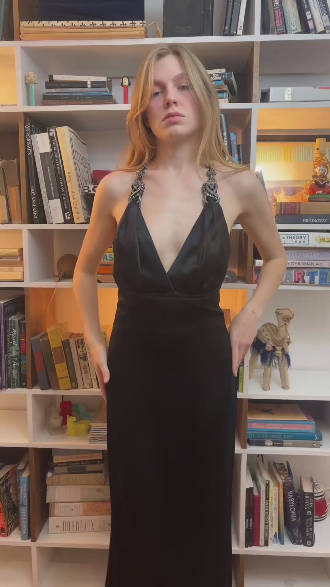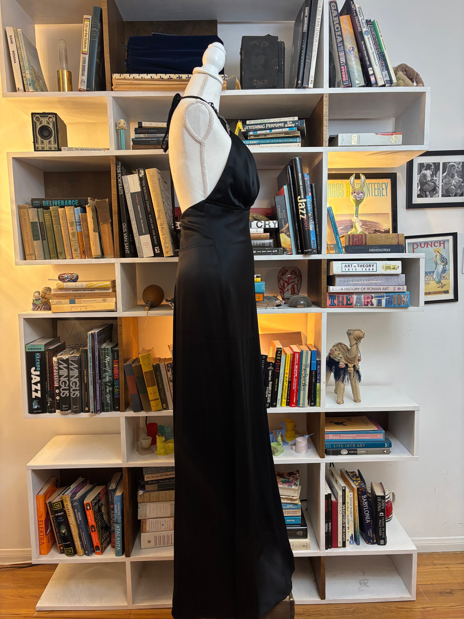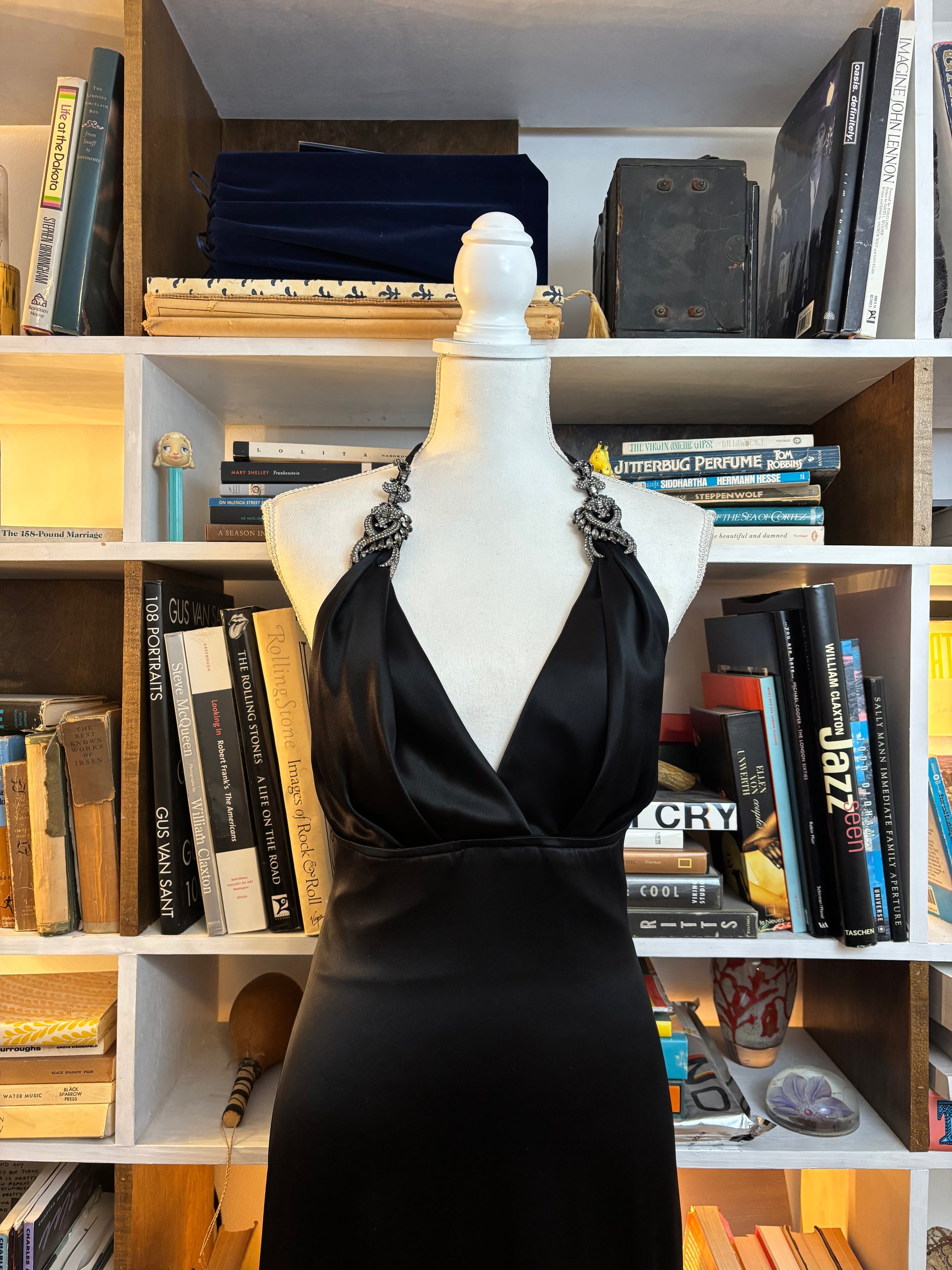 Features beautifully decorated halter neckline with rhinestone embellishment