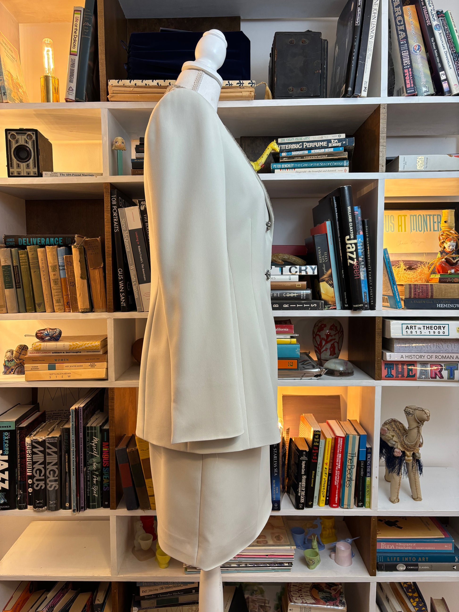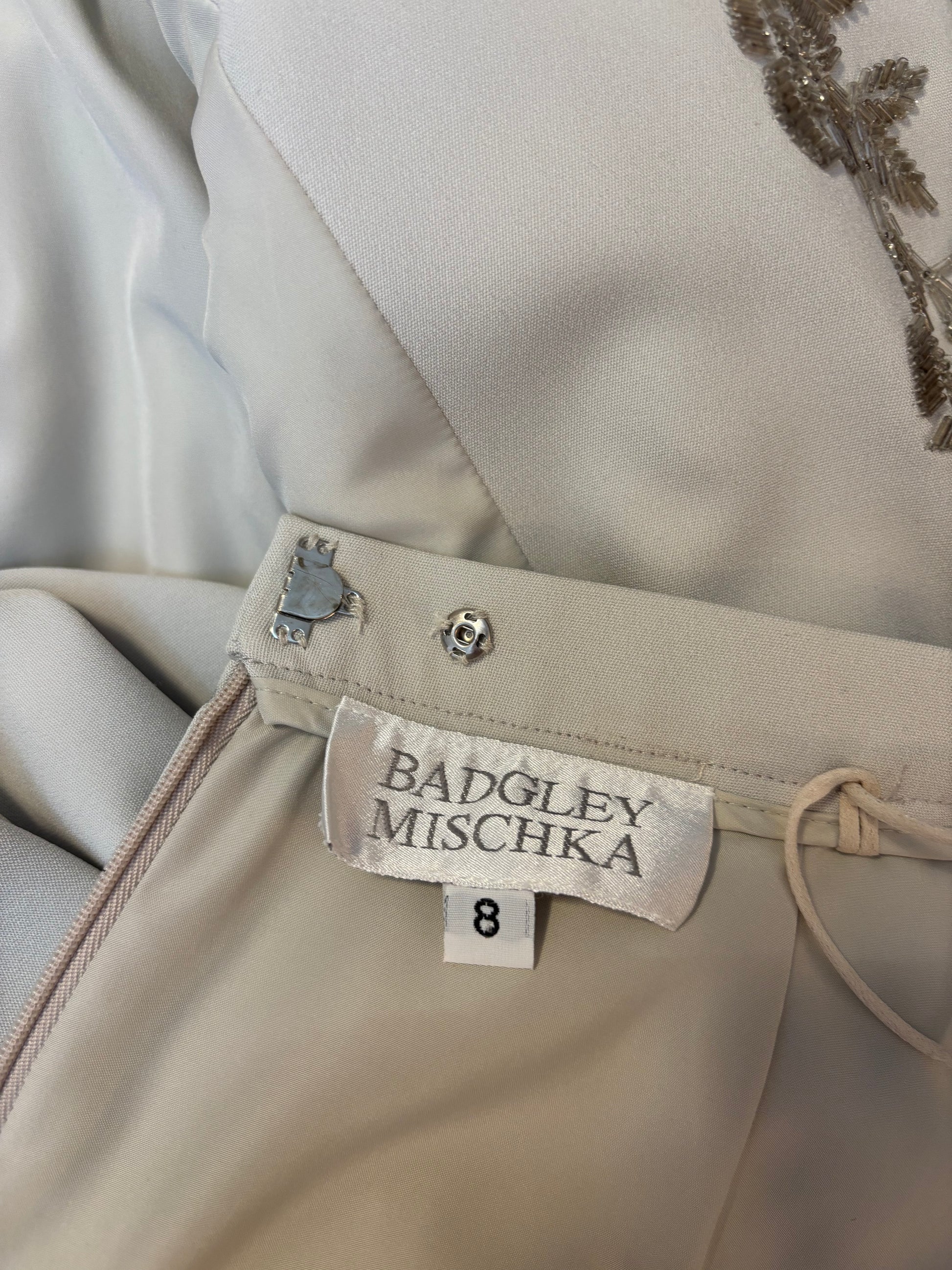 This Badgley Mischka 2-piece evening set includes a sequined jacket and a straight skirt. The jacket features embellished neckline, combining elegance with sparkle. It is in excellent pre-owned condition and made in Hong Kong.