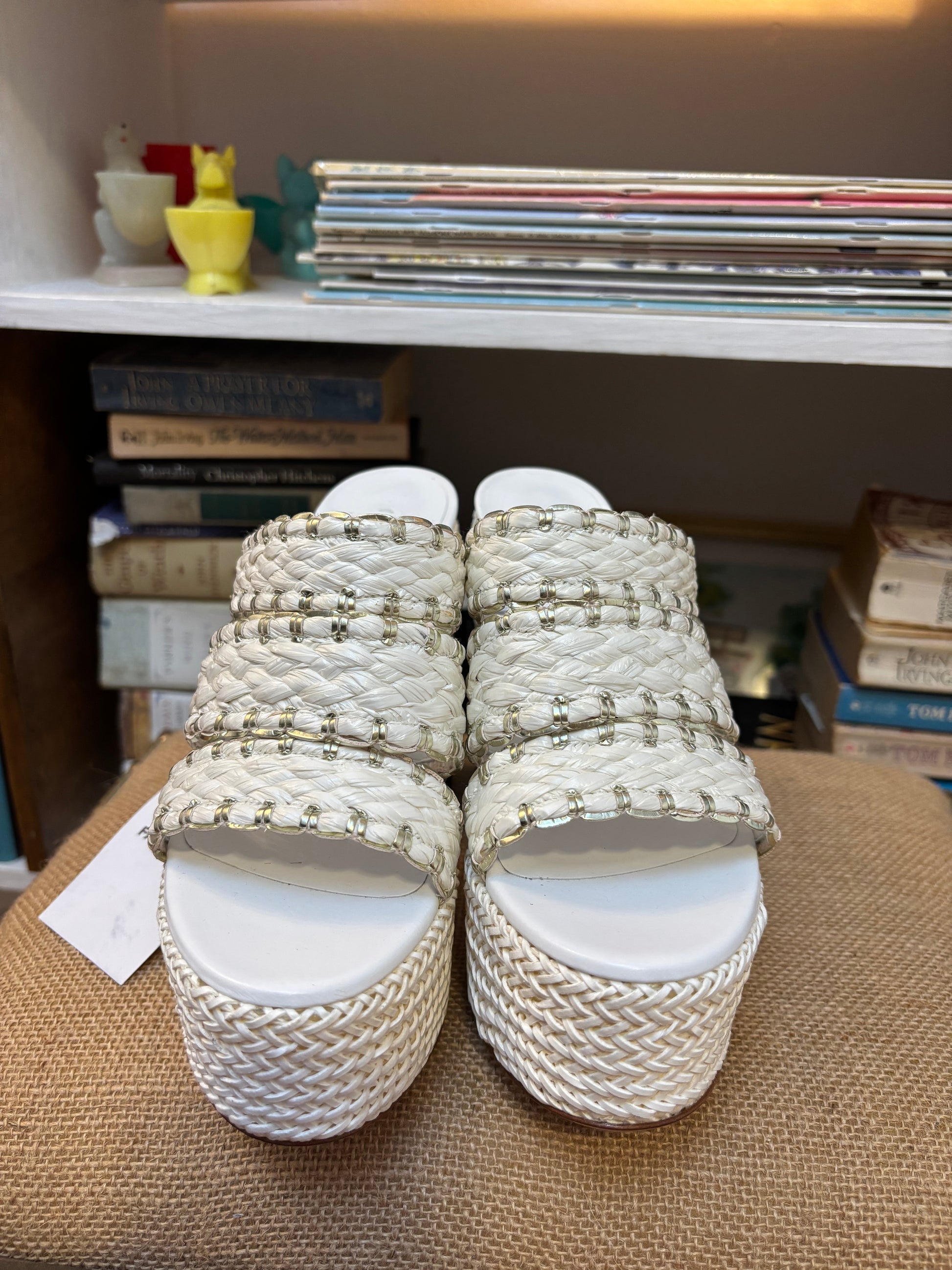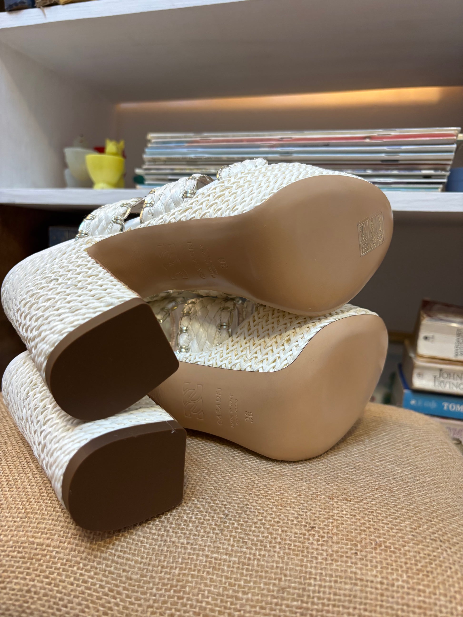 Features woven raffia design and rubber outsole