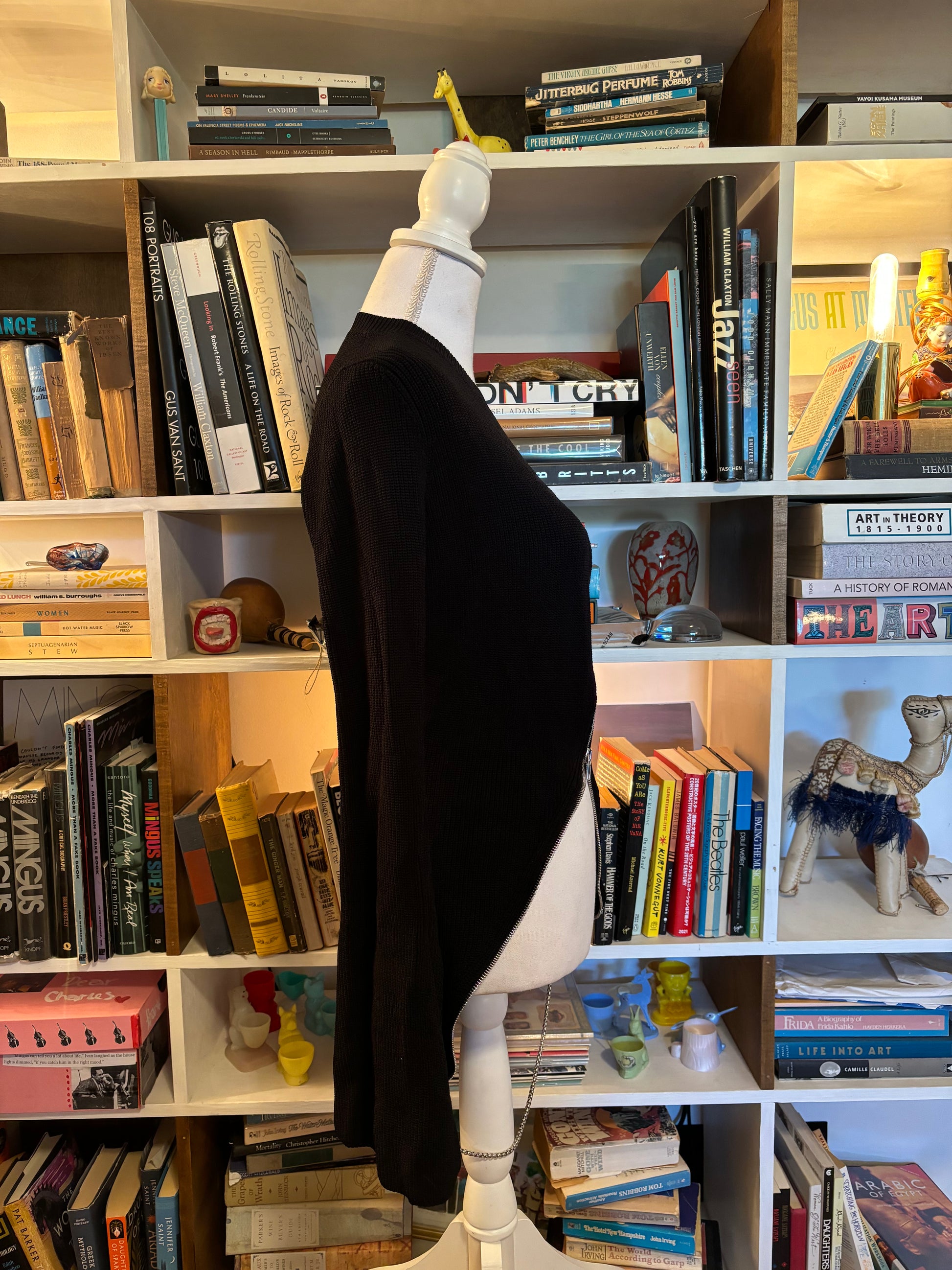 this sweater features bell sleeves and a flattering slimming fit and a chain trim