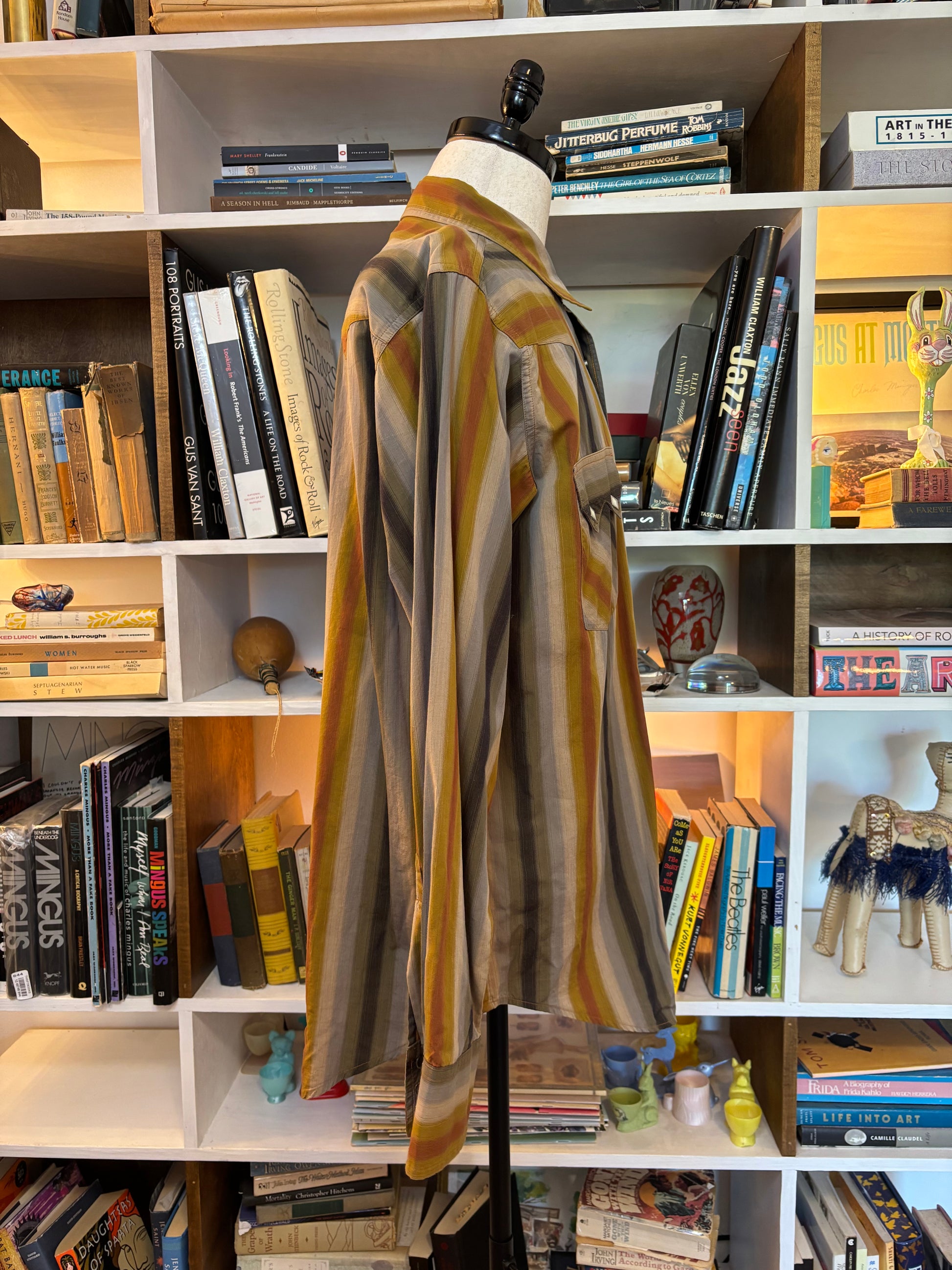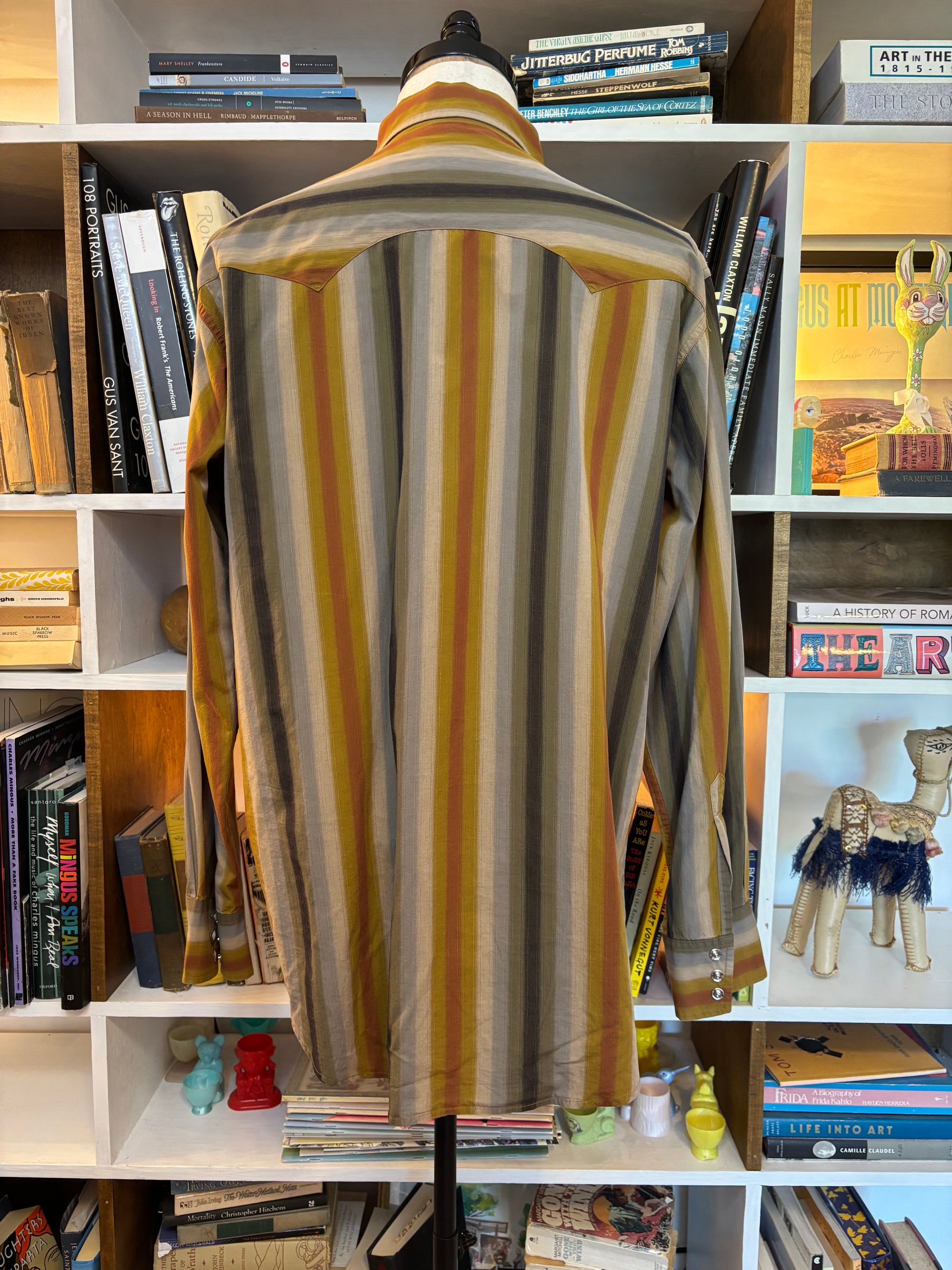 features striped pattern and diamond shaped snap buttons