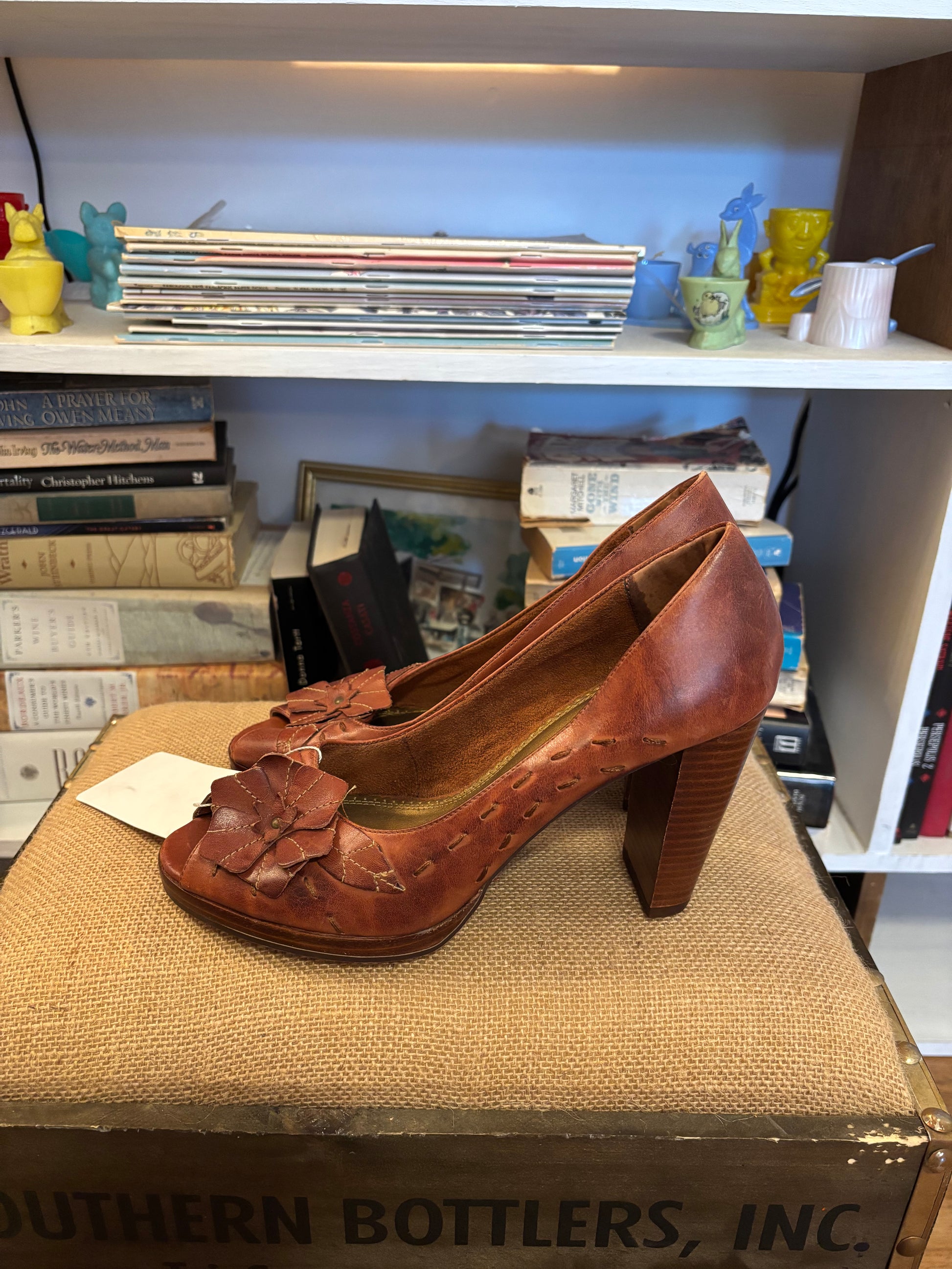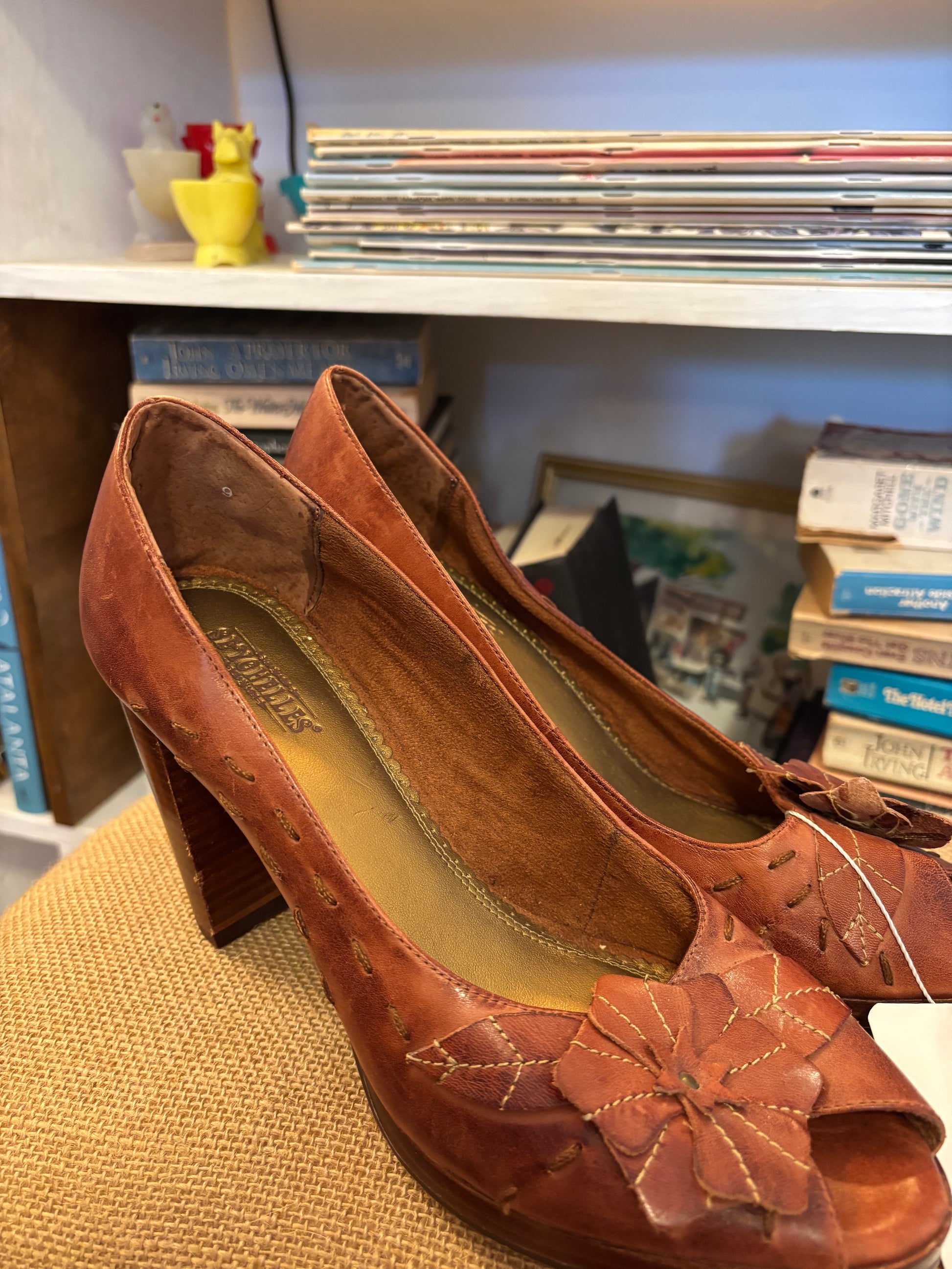 seychelles brown leather peep toe heels with floral detailing