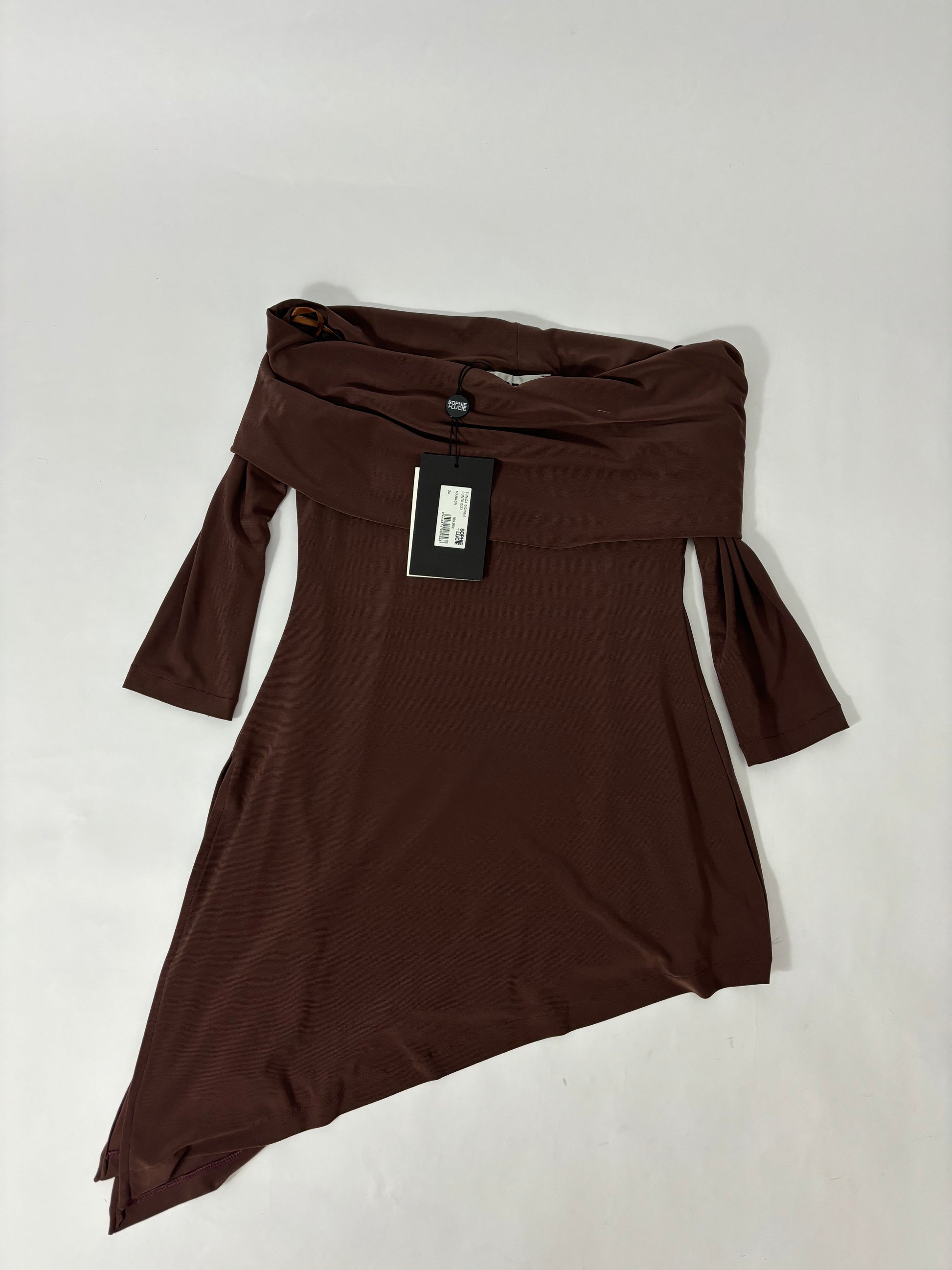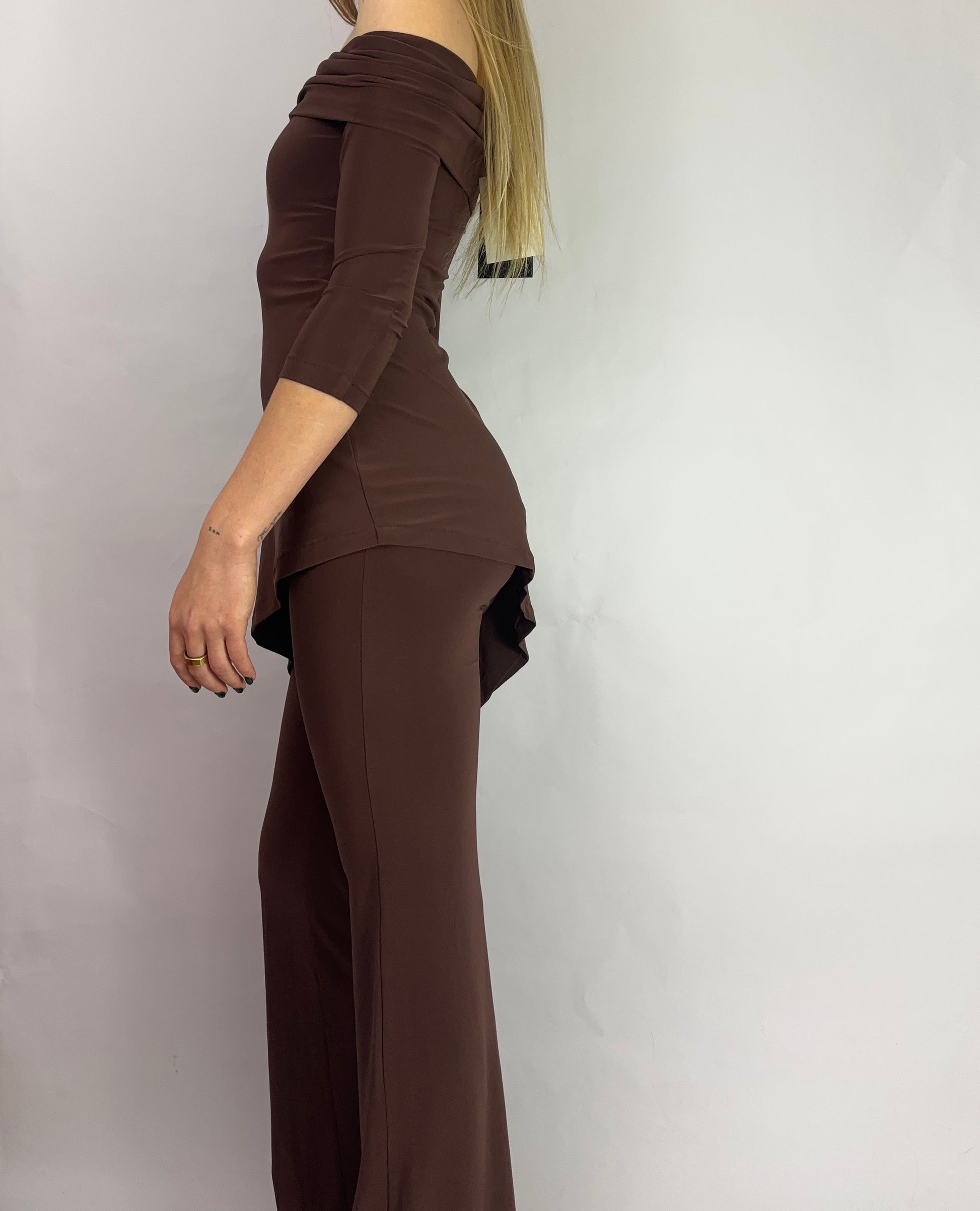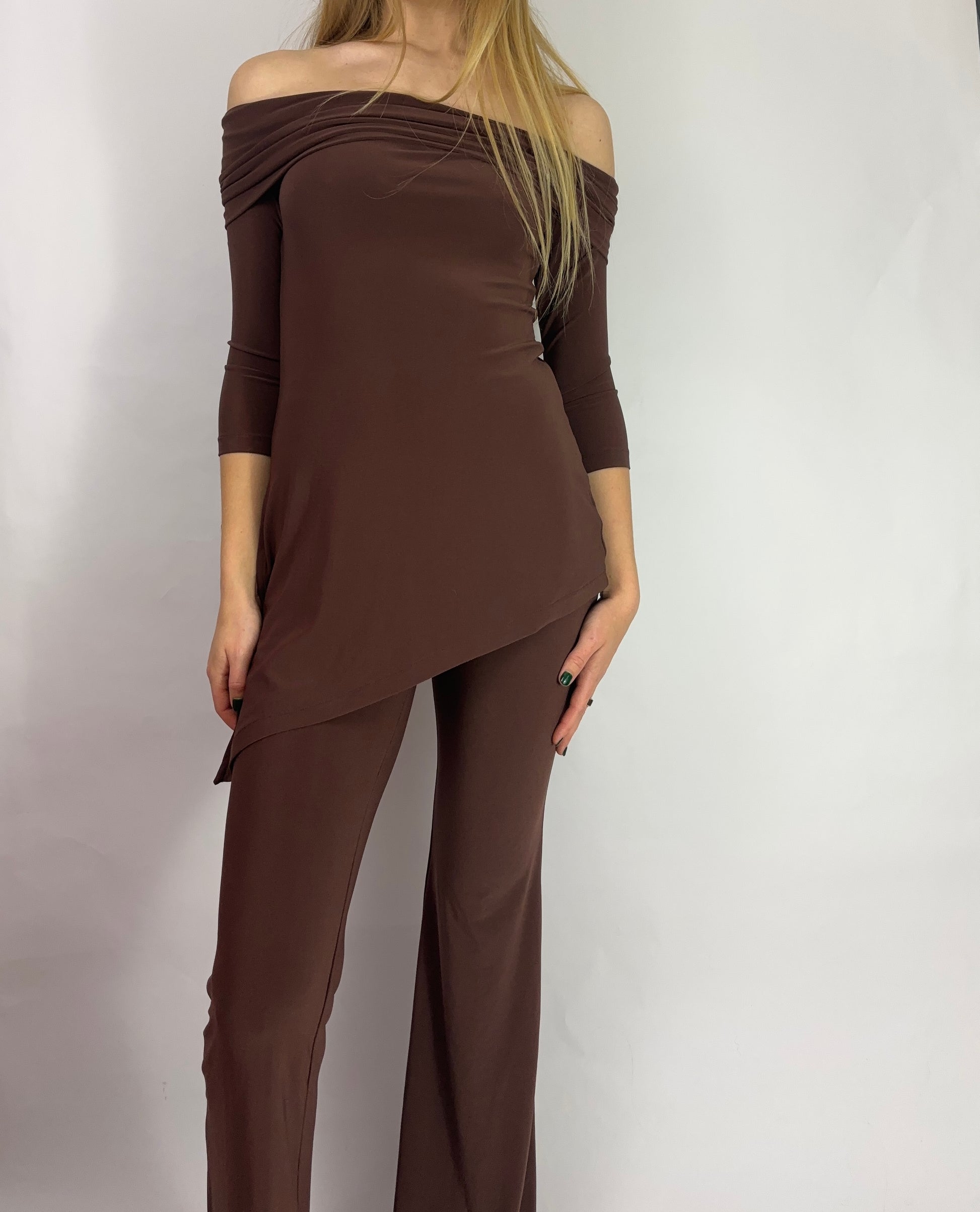 Tunic made from a plain knitted fabric. Strapless neckline with possible positions and 3/4 length sleeves. Asymmetrical, flowing drape High-waisted trousers in a soft and comfortable knitted fabric, elasticated at the waist and flared hems.